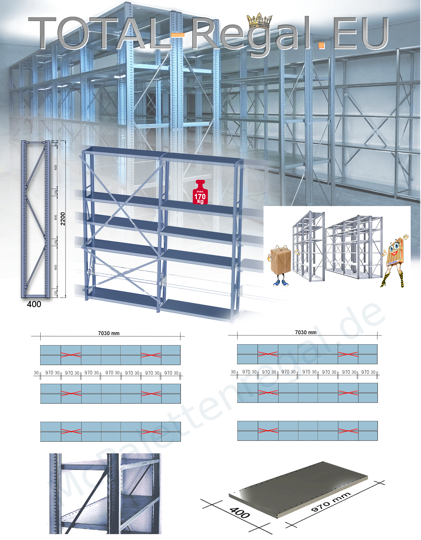 Weiterführende Links zu "6 Doppelreihen FACHBODENREGALE 2,2 m hoch, 0,4 m tief, je 7 Felder, je 5 Böden 97cm"