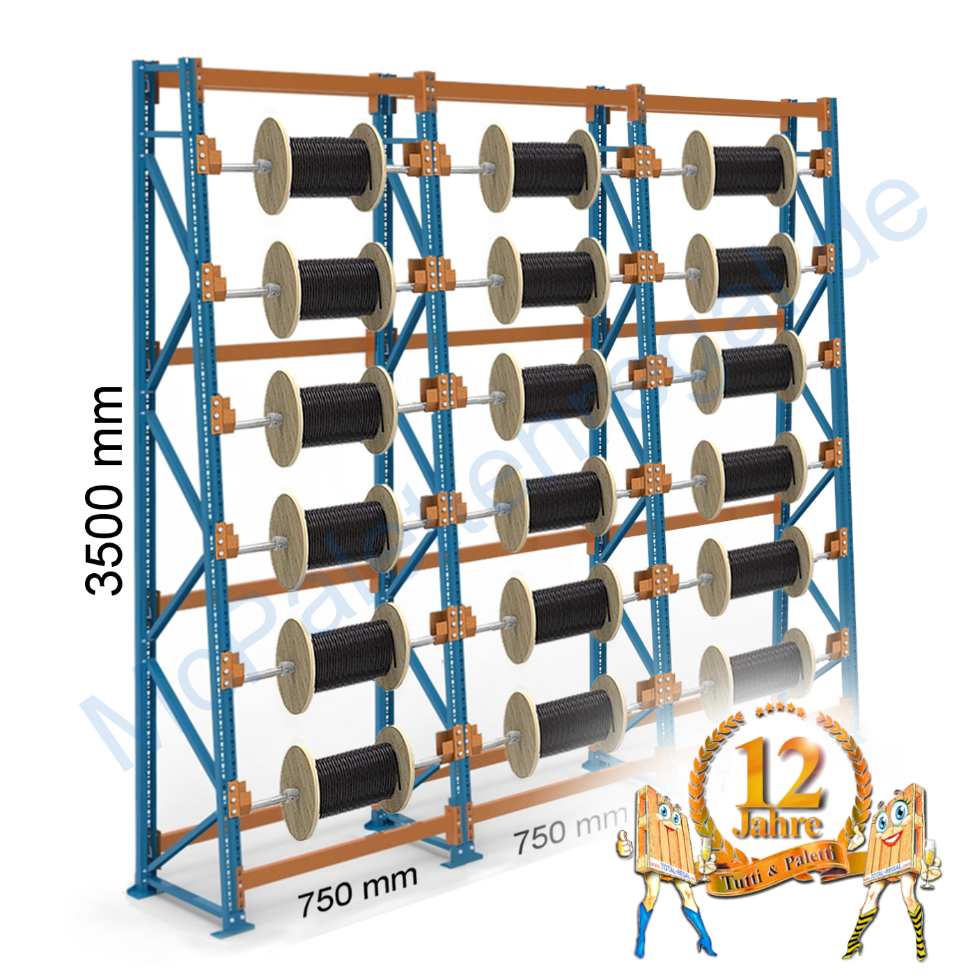 Kabeltrommelregal schräg 3,5 m hoch, 3 Felder, je 6 Trommel-Ebenen