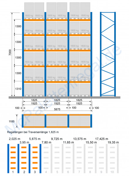 Produktinformationen "Palettenregal 7,0 m hoch, Feldbreite 1,825 m, 5 Traversen-Ebenen ( = 4 Rahmen + 30 Traversen)"